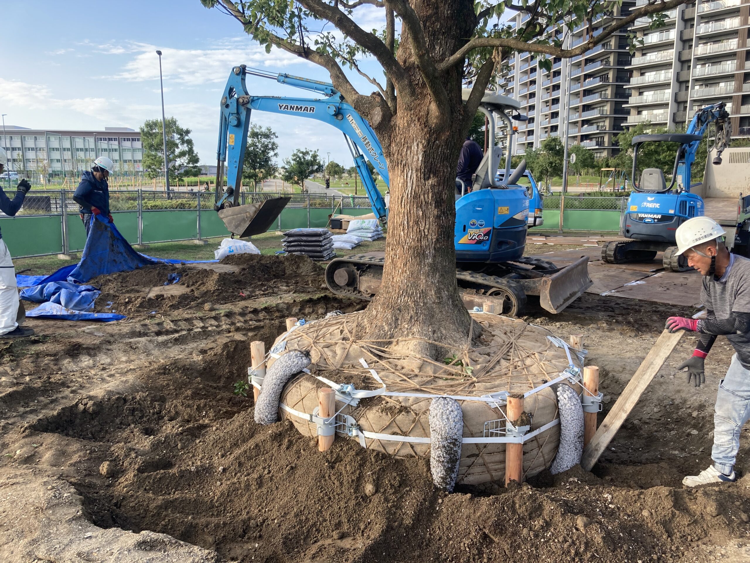 地域の人々に末長く愛され、次の世代へと受け継がれる緑の空間づくりとして、高さ10mのシンボルツリーを植栽しました。植栽樹種は周辺環境や地域の風土に適したクスノキを選定しました。施工の際は安全対策を徹底するとともに、樹木の健全な生育を目的とした植栽基盤をつくり、根鉢固定型の地下支柱を設置するなど、将来の景観バランスにも配慮し、訪れる人にとって親しみやすい空間となるよう仕上げました。
